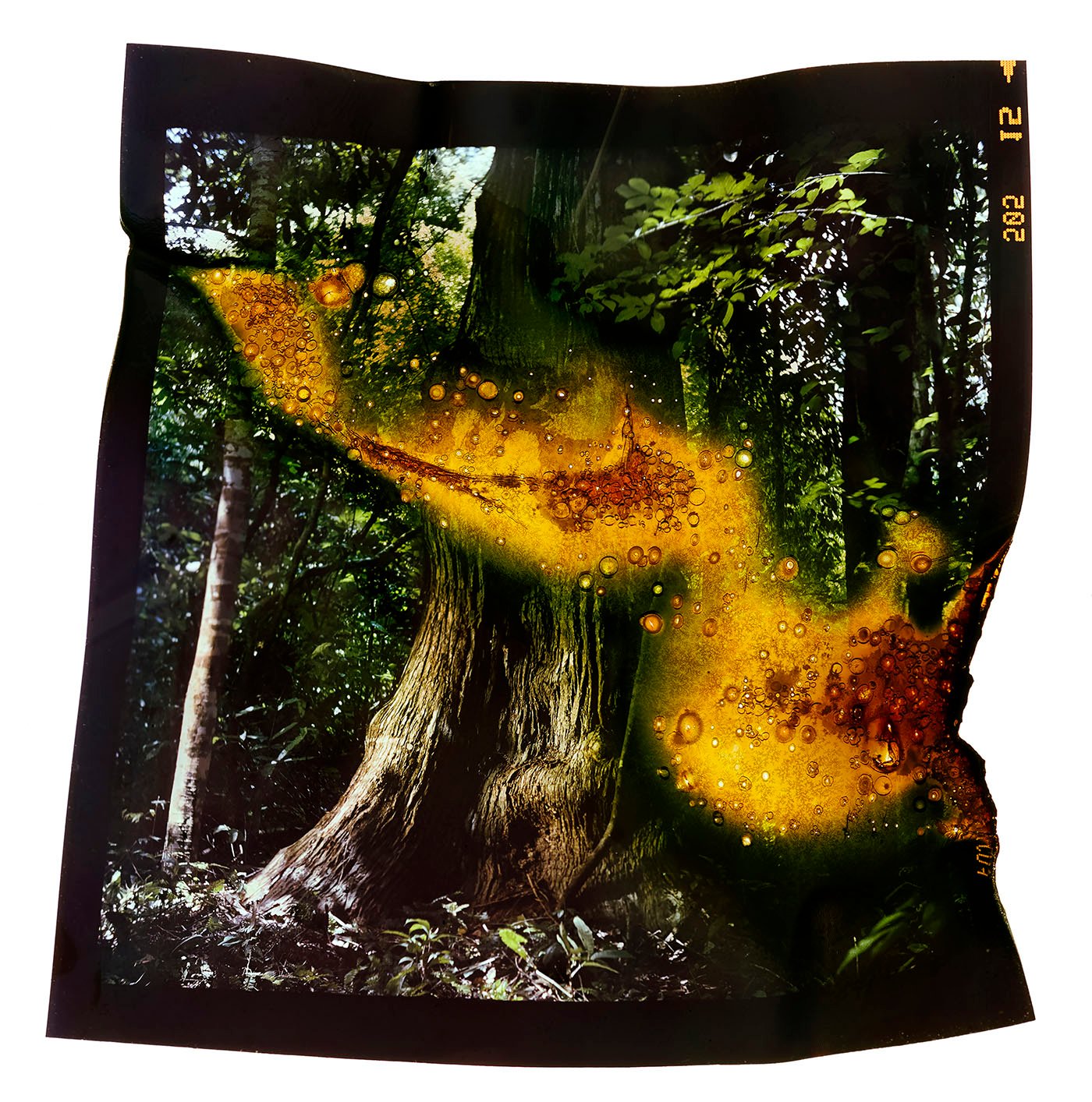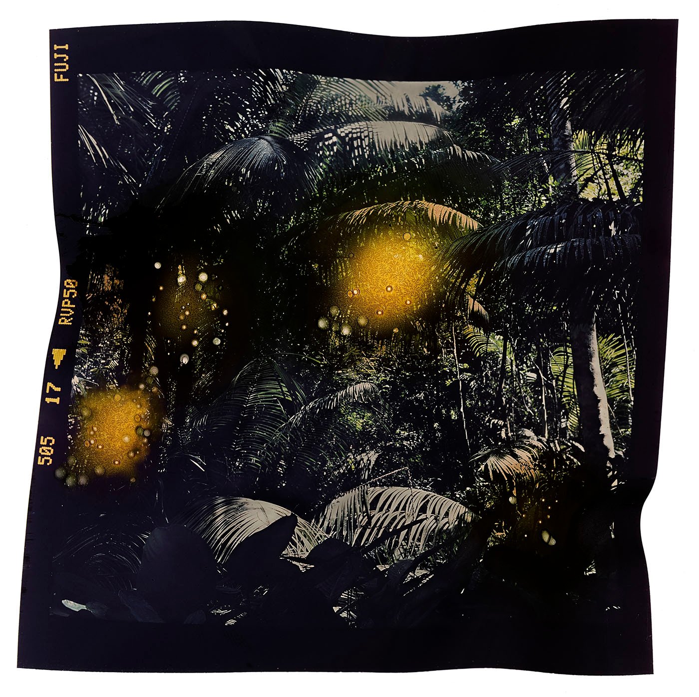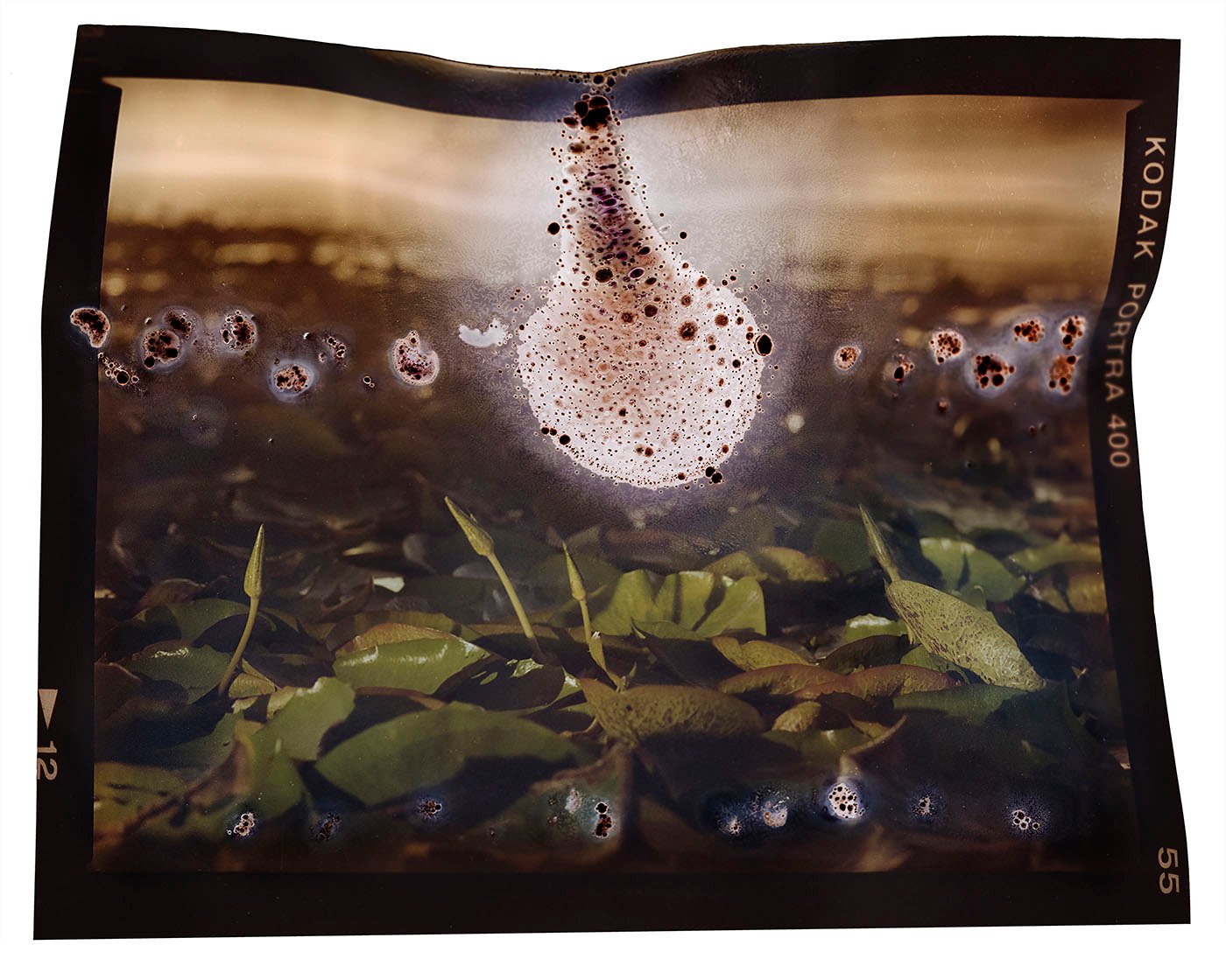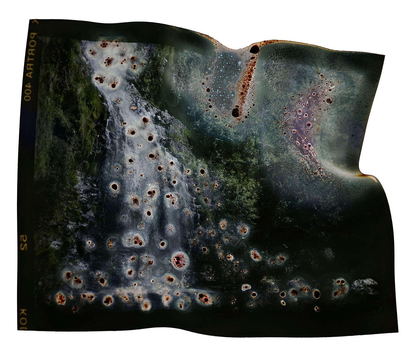 El trabajo se desarrolla de la siguiente manera: en primer lugar, tomo fotografías de áreas naturales de gran relevancia para la conservación en mi país natal, Brasil, con una cámara analógica de formato medio. Después de revelarlas, quemo sistemáticamente la película fotográfica, reproduciendo en las representaciones la agresión que se ha infligido abiertamente a los paisajes reales. Después de quemarlas, las piezas tridimensionales resultantes se digitalizan y se presentan en yuxtaposición a pies de foto que consisten en noticias sobre incendios ocurridos recientemente en Brasil, así como a reflexiones que tengo durante la realización de la obra, haciéndose eco de la magnitud de la violencia y la destrucción por el fuego a la que nos hemos enfrentado en el Antropoceno en América Latina.
