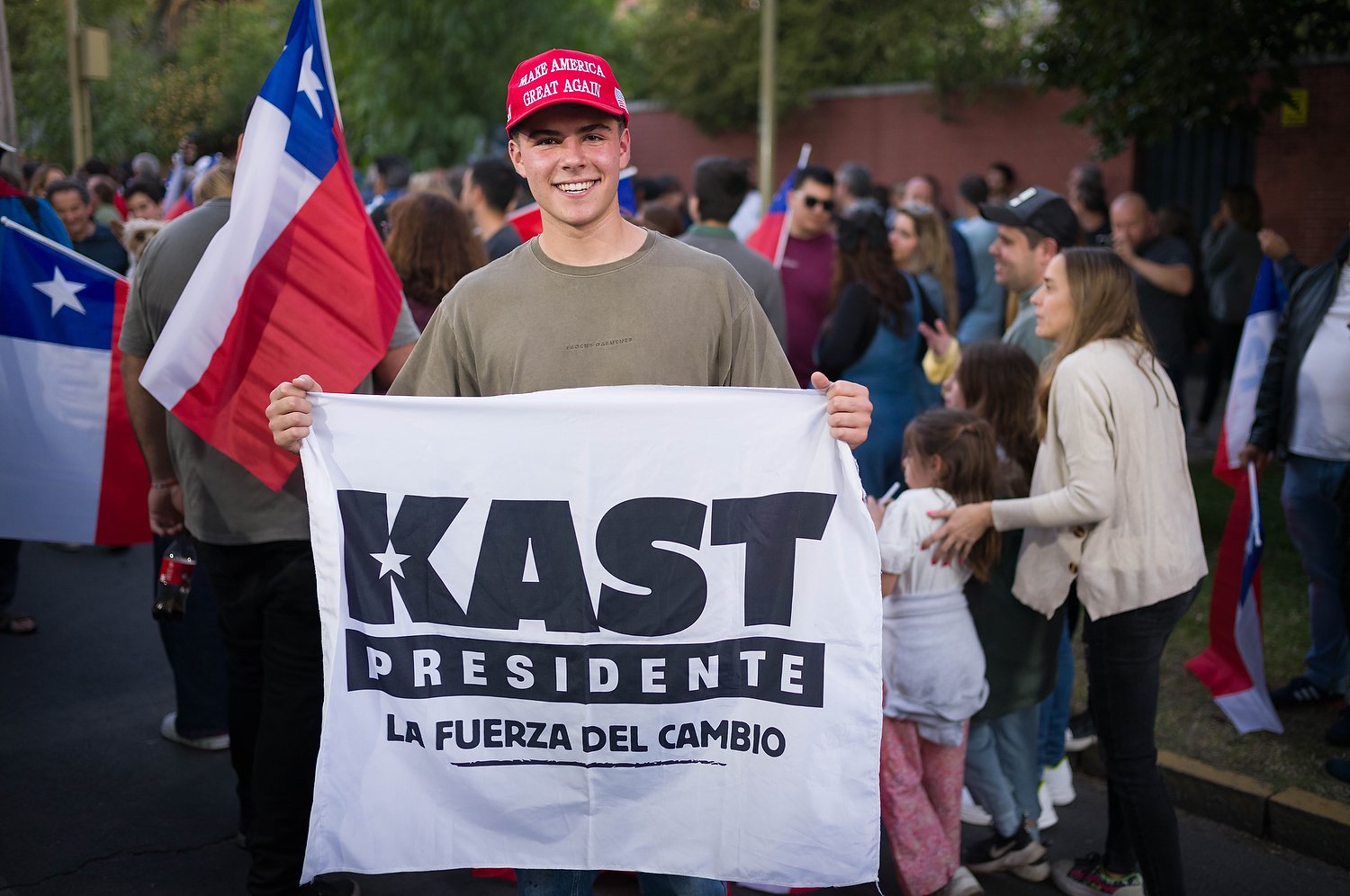 Parafraseando el eslogan de Donald Trump —otro joven en el mismo evento de Las Condes—, portando la típica gorra del mandatario estadounidense, dijo exaltado: “Hagamos Chile grande otra vez”.
