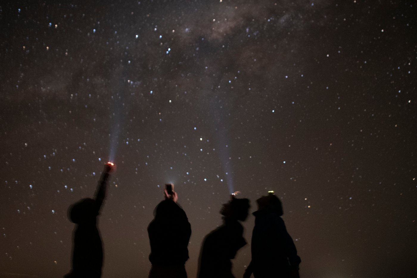 Cuatro miembros de la brigada de Fuegas, en la localidad de La Rinconada, al norte de Córdoba, iluminan el cielo con sus linternas. Esto ocurrió cuando regresaban de un curso de primeros auxilios al que los bomberos de La Rinconada, una localidad al norte de Córdoba, los habían invitado. En el camino de vuelta, se detuvieron a observar las constelaciones, buscando formas que se asemejaran al fuego.