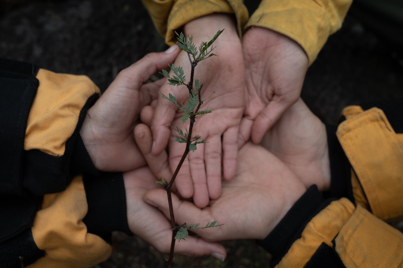 Tres integrantes de la brigada sostienen una rama con brotes del árbol de algarrobo (Prosopis alba), muy resistente a los climas semiáridos y a las sequías intensas. El fruto muy dulce de este árbol ha servido como alimento y nutrición para los pueblos indígenas durante cientos de años. Actualmente, se está recuperando la práctica de consumir este fruto, aunque no se utiliza ampliamente en la industria alimentaria. El cuidado de los bosques nativos es uno de los pilares del movimiento de brigadas en Córdoba, una provincia donde solo el 2 % de los bosques nativos se encuentran en buen estado.
